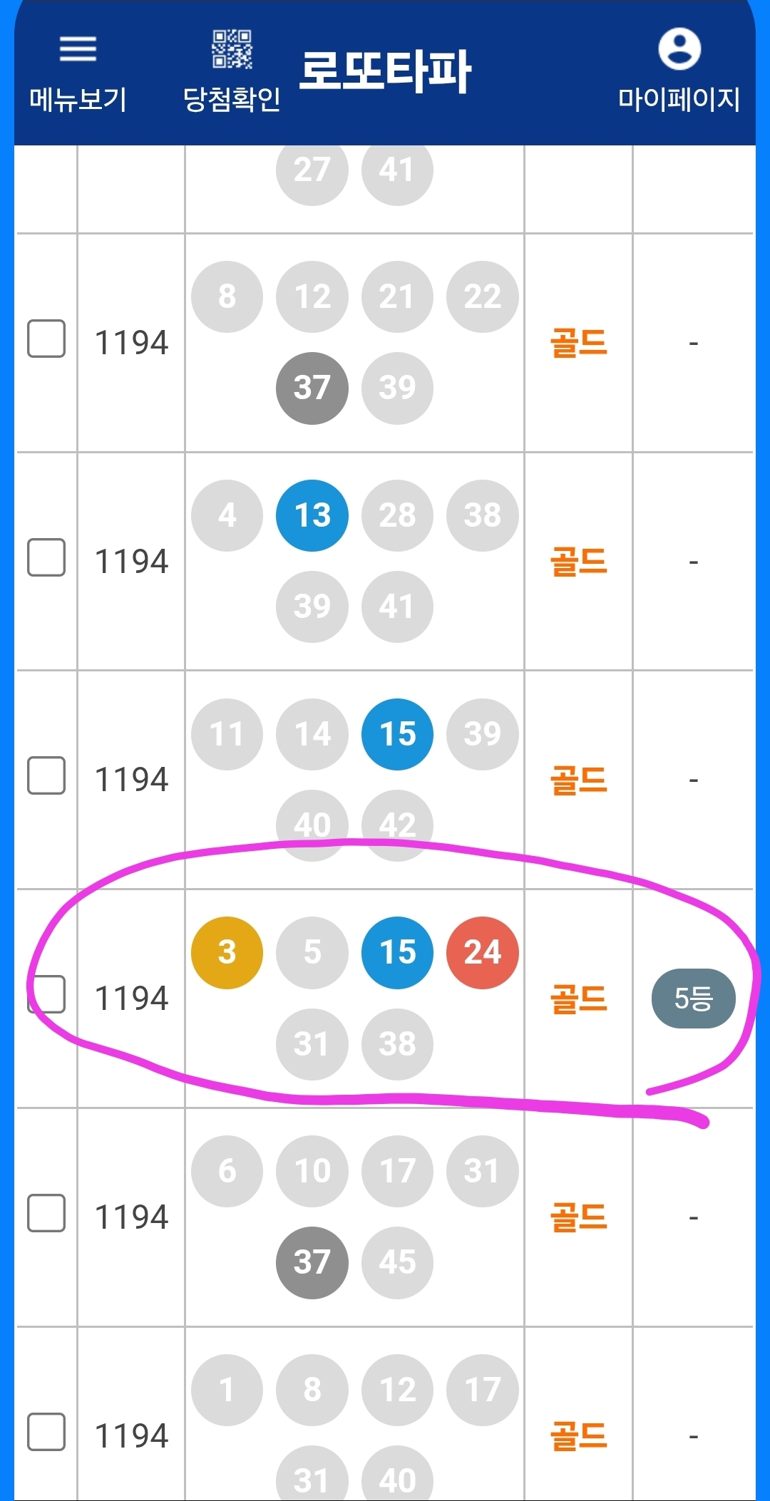 골드 가입한 첫회차에 5등 당첨. 감사합니다