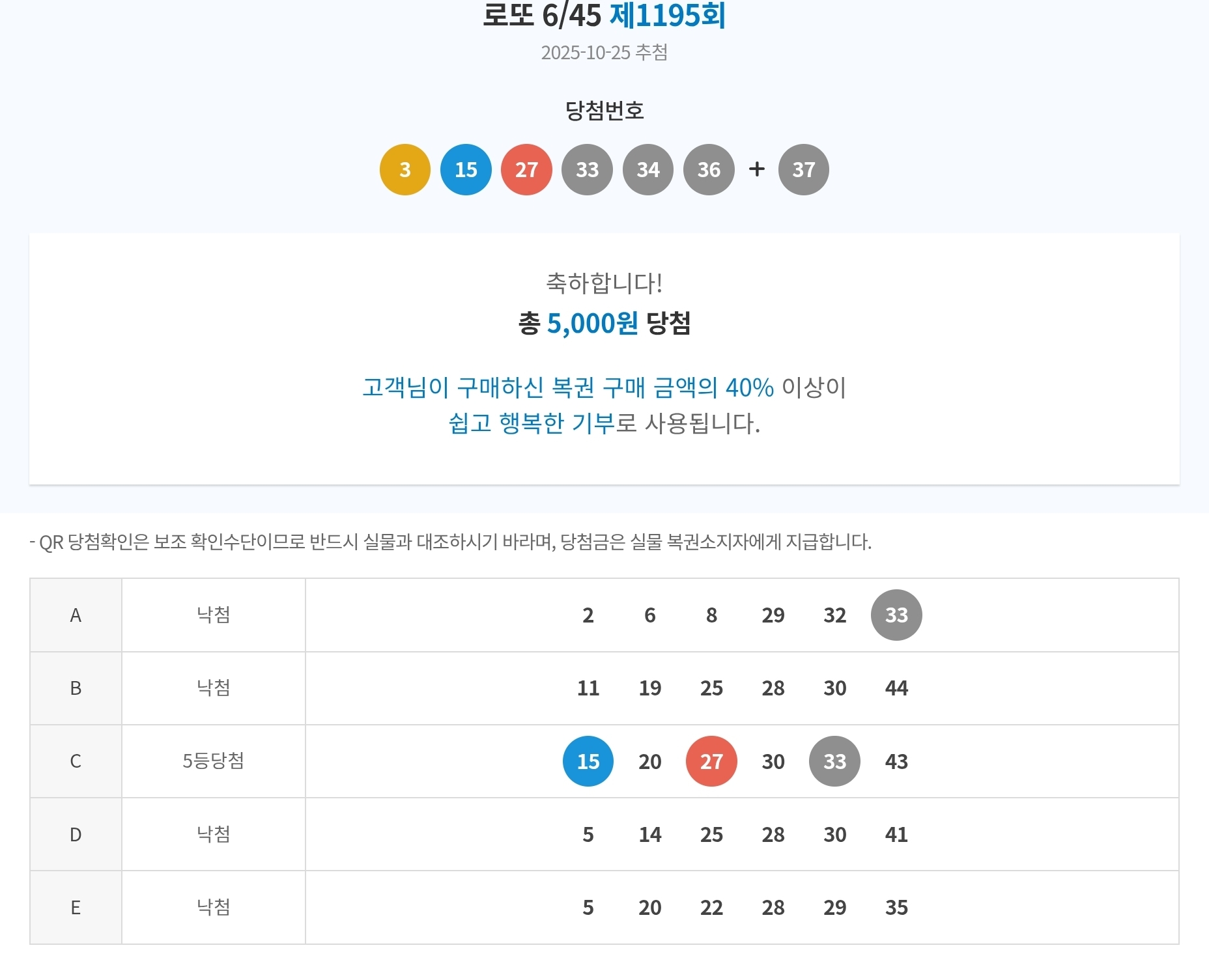 개인적으로 산 자동 2게임 포함 총 5등 3게임 당첨되었습니다