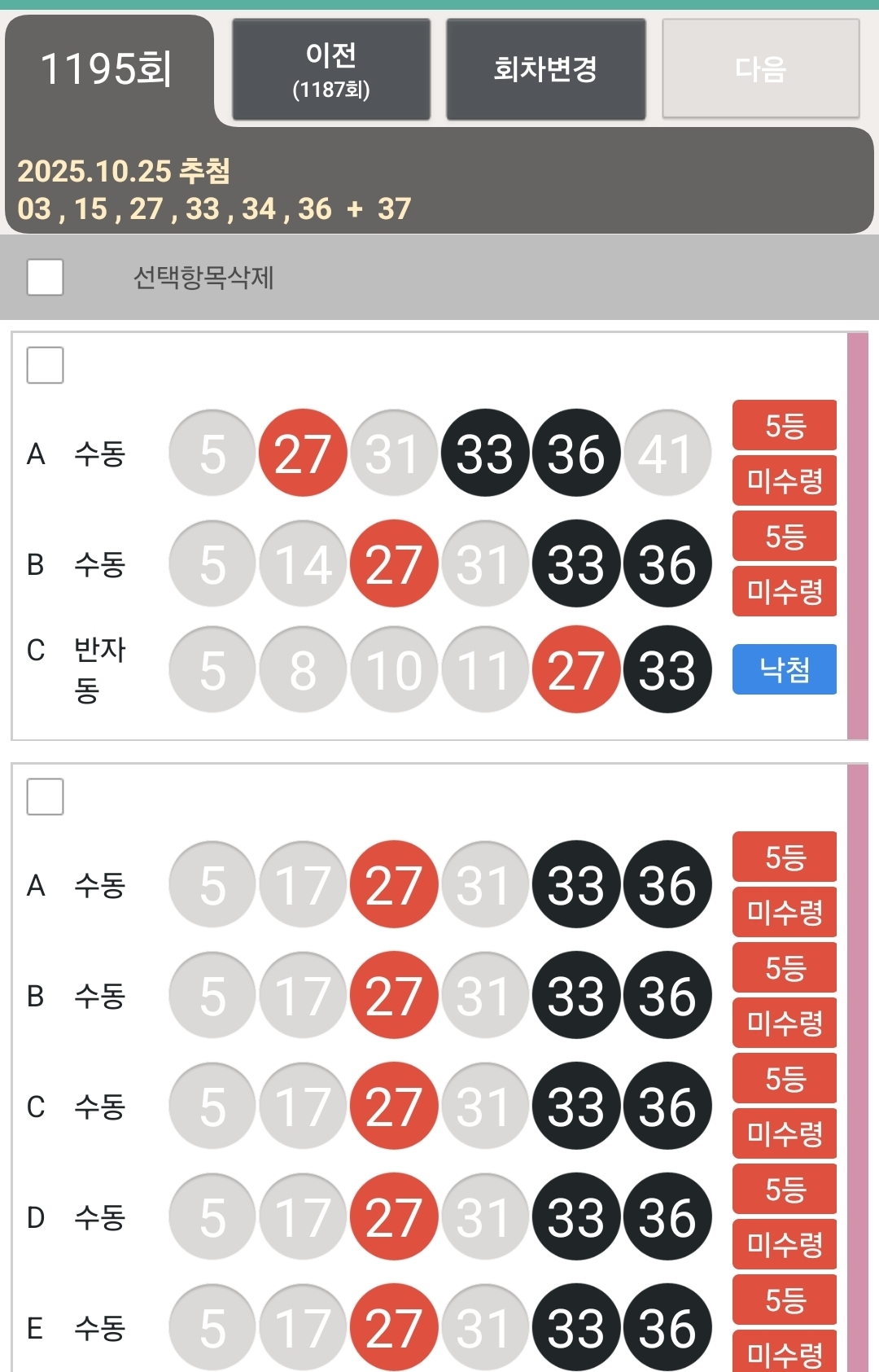 오랜만에 5등 7개 터졌어요 ㅋㅋㅋ